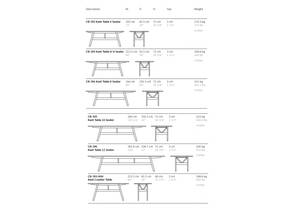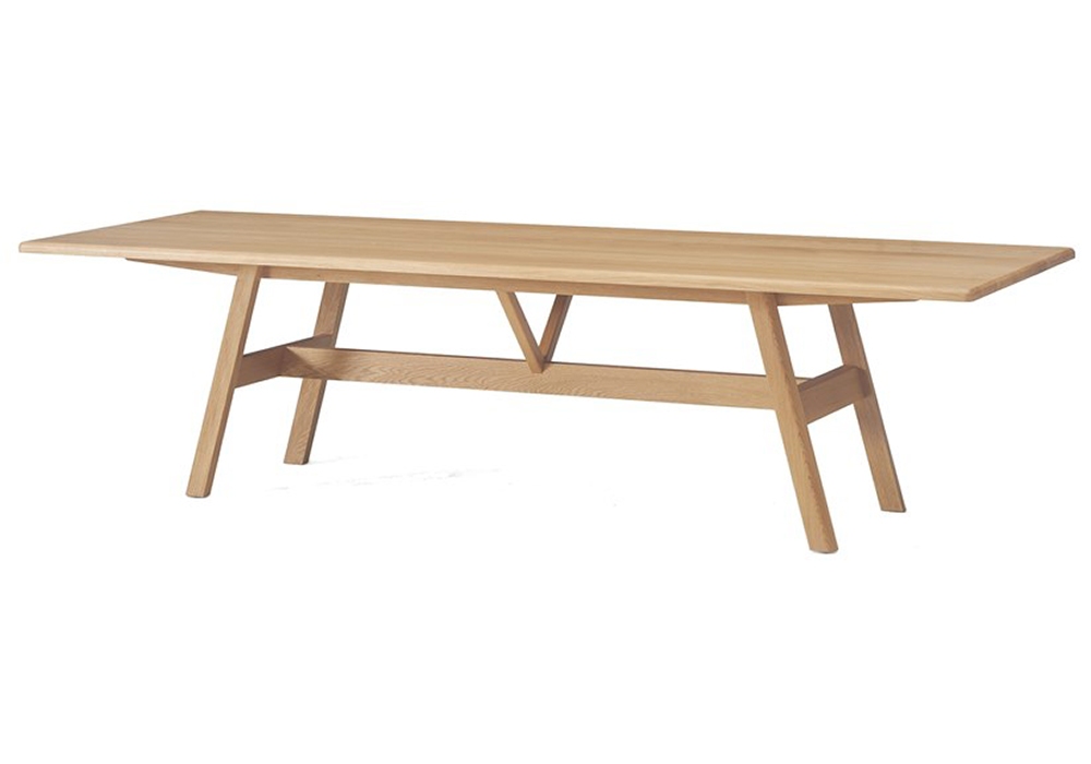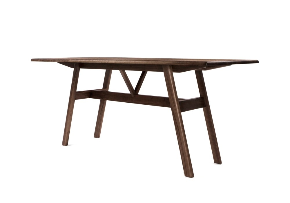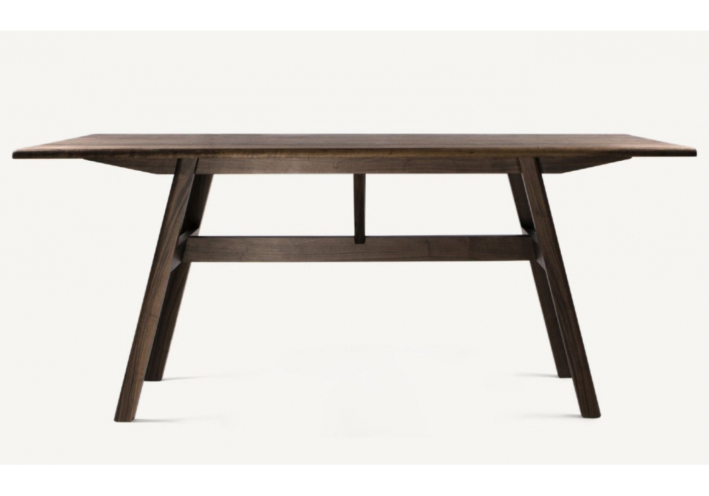 Tavolo da pranzo Kant disegnato da Craig Bassam per BassamFellows, tavolo disponibile in diverse finiture di legno, strutturato con un piano dai bordi arrotondati e sostenuto da due travi gemelle e da un traliccio di sostegno a forma di V il tutto legato a 4 gambe angolari.