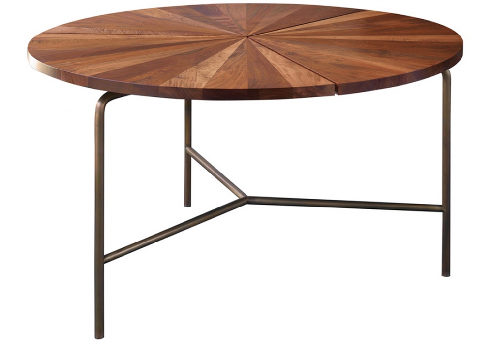 Tavolo circolare disegnato da Craig Bassam per Bassam Fellows, è un tavolo da pranzo composto da 3 parti in legno sepatarete tra loro e tenute insieme da un tubolare di ottone, base di due finiture, bronzo e acciaio inossidabile solido rivestito nanoceramico.