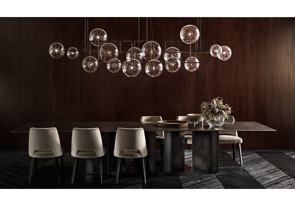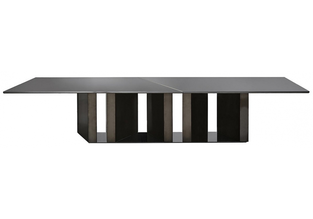 Platium System firmato da Oscar & Gabriele Buratti per Gallotti&Radice è un tavolo con piano modulare in cristallo 15mm e base in legno rivestito in cristallo 6mm decorato a mano nella finitura esclusiva bronzo antico e piombo. Disponibile anche versione in cristallo verniciato bronzo patinato. Importante bisellatura di 4cm su due lati del piano. Dettaglio di giunzione tra i piani in ottone satinato. Piatto a terra in acciaio inox lucido "supermirror". Disponibile versione con base in legno rivestito in marmo 20 mm Sahara Noir, Stardust Grey o Calacatta Vagli Oro.