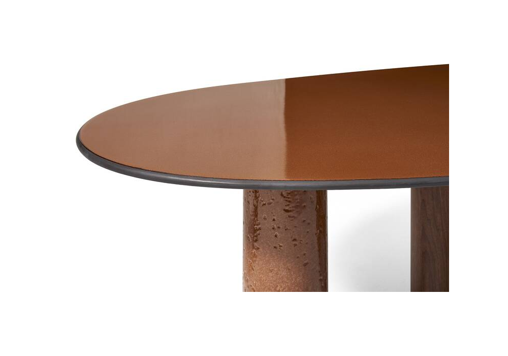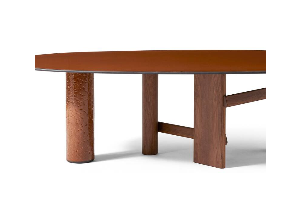 559 Sengu firmato da Patricia Urquiola per Cassina è un tavolo ovale realizzato con piano e piede a colonna in marmo o in gres porcellanato e gambe in legno. Disponibile in diverse finiture.