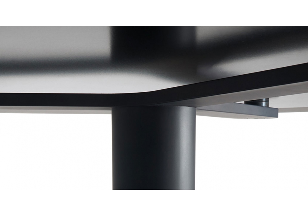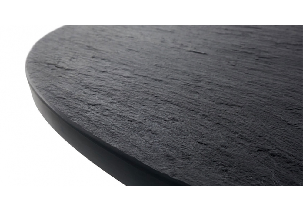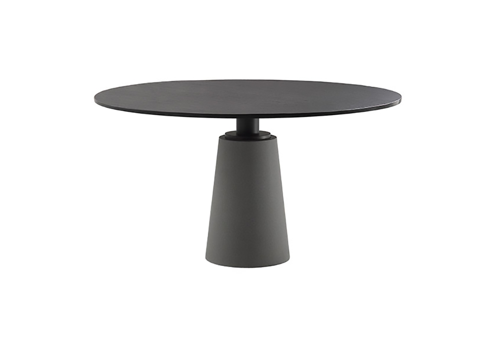 Mesa firmato da Lella e Massimo Vignelli per Poltrona Frau è un tavolo rotondo con piano in ardesia ligure e base a colonna in Pietra Serena grigia.