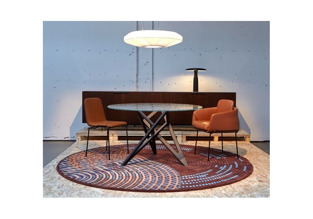 Ennea firmato da Vincent Tordjman per Ligne Roset è un tavolo rotondo con gambe in rovere e piano in vetro fuso spessore 12 mm temperato. La superficie inferiore è fusa per ottenere effetti in rilievo e un aspetto traslucido per deformazione.