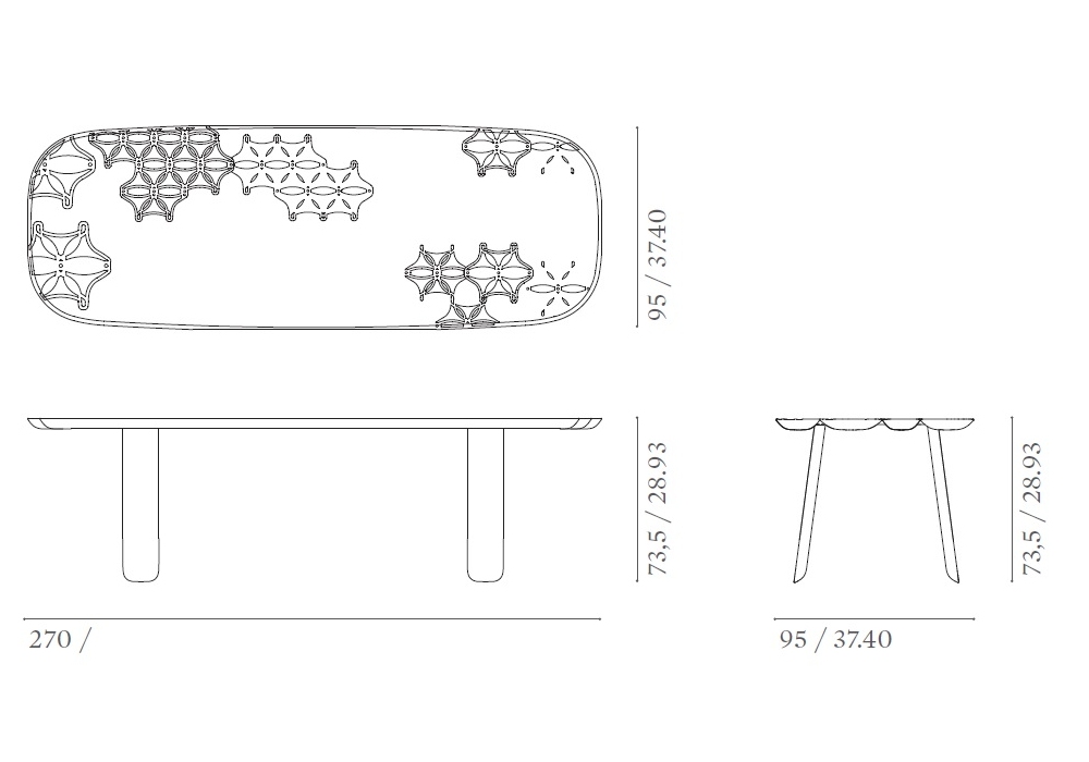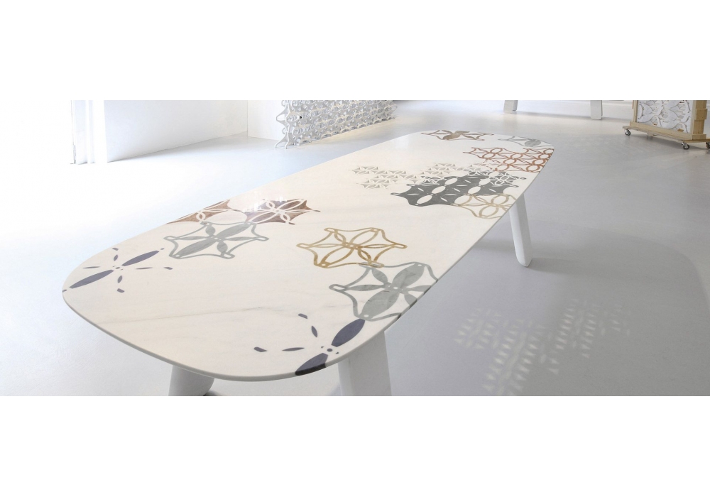 Marblelace Biscuit firmato da Patricia Urquiola per Budri è un tavolo in realizzato con marmo Bianco Lasa levigato e intarsiato. Gli intarsi si sovrappongono formando trame di pizzi, un colorato drappo che scende fluidamente lungo la costa del piano. I pizzi a traforo nel marmo bianco confluiscono negli intarsi colorati. Arrotondati, come un biscotto, i piedi in marmo a massello, che si abbinano al piano.