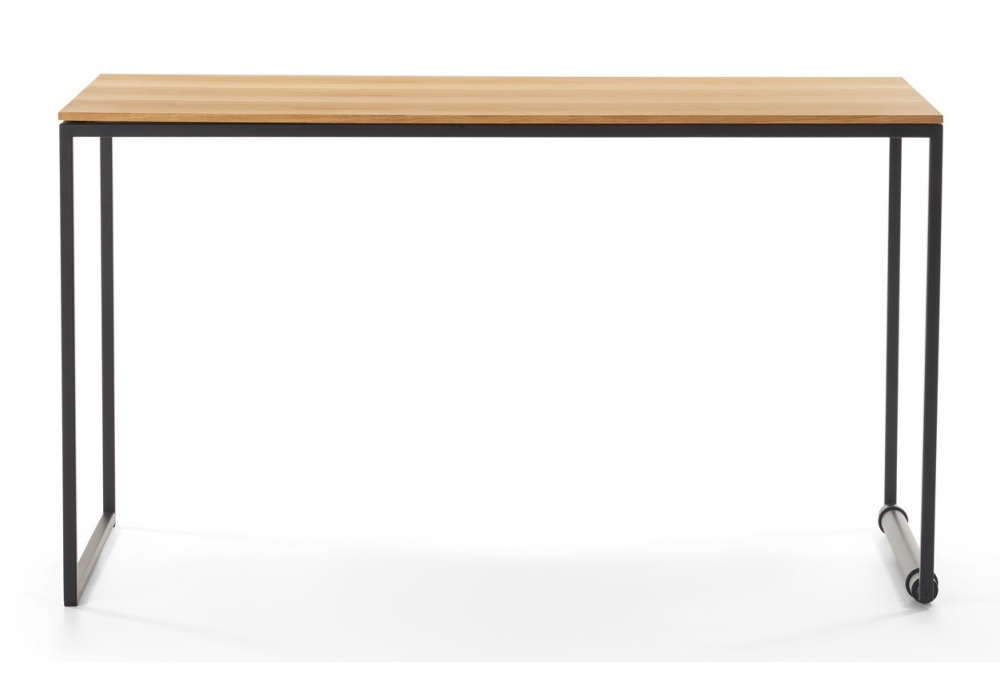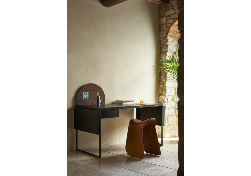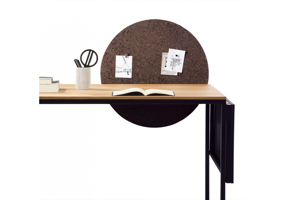 Macis firmato da Lapo Ciatti per Opinion Ciatti è un tavolo / scrivania con struttura in acciaio, piano sottile in PET o legno. Facilmente spostabile grazie a un rullo in alluminio con due o-ring neri salva graffio. É possibile aggiungere due prolunghe, cassetto sottopiano con struttura nera e frontale coordinato con il piano, pannello circolare per appunti in sughero bruno e acciaio, posizionabile a destra o a sinistra, e passacavi rettangolare in alluminio nero.