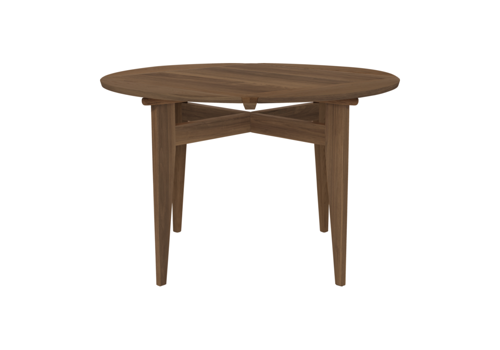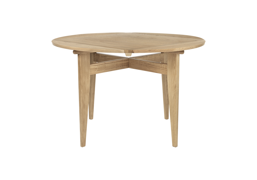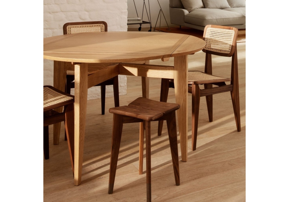 B-Table firmato da Marcel Gascoin per Gubi è un tavolo da pranzo pieghevole realizzato in noce americano o rovere. Può essere rotondo o quadrato a seconda dell'impostazione utilizzata.