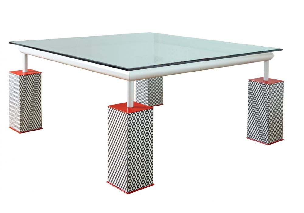 Mandarin firmato da Ettore Sottsass per Memphis Milano è un tavolo realizzato in laminato plastico, metallo e cristallo.