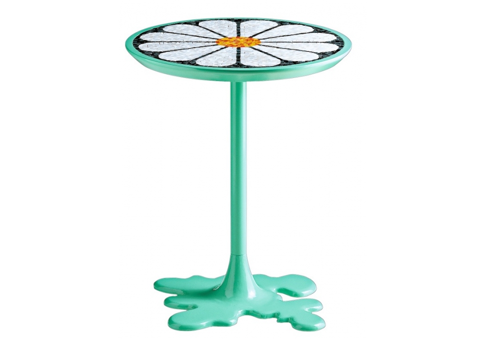 6500 Hispo firmato da Alessandro Mendini per Zanotta Edizioni è un tavolo con base in fusione di alluminio, gambo in acciaio e piano in legno, colore verde. Decorazione in mosaico policromo incassato nel piano.