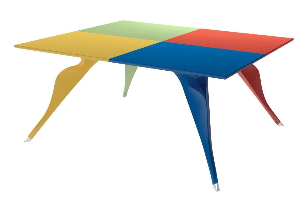 7020 Macaone firmato da Alessandro Mendini per Zanotta Edizioni è un tavolo con piano in MDF e gambe in poliuretano rigido con struttura in acciaio verniciato nei colori rosso, blu, giallo e verde. Piedini in lega di alluminio lucidato.
