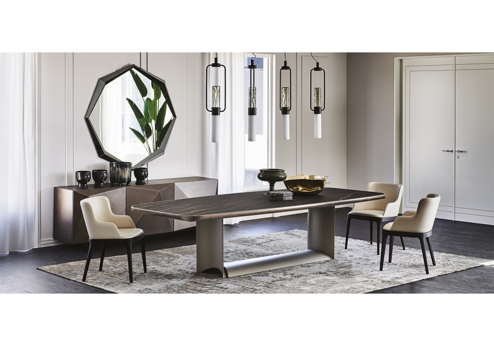 Dragon Keramik Premium disegnato da Paolo Cattelan| per Cattelan Italia è un tavolo realizzato con base in acciaio laccato goffrato. Piano in ceramica Marmi in diversi colori con profilo inferiore arrotondato e verniciato Brushed Bronze o Brushed Grey. Il piano 300x128 ha lo spessore di 6cm, il 200x120 e il 240x120 di 5cm.