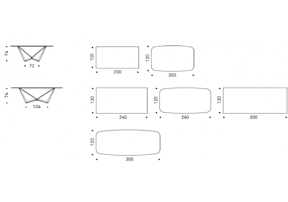 | Dimensioni | 200 x 100 x H 74 cm; 200 x 120 x H 74 cm; 240 x 120 x H 74 cm; 300 x 120 x H 74 cm. |