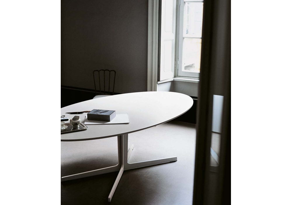 Split firmato da Claesson Koivisto Rune per Tacchini è un tavolo con base in metallo verniciato a polvere e piano in MDF laccato. La base è sempre in tinta con il piano. Disponibile in diverse finiture e dimensioni.