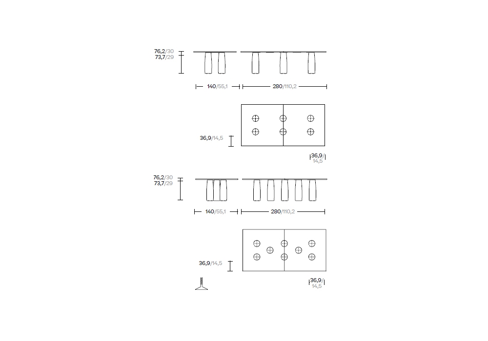 | Dimensioni | Ø 165 x H 76,2 cm; 140 x 140 x H 76,2 cm; 280 x 140 x H 76,2 cm. |