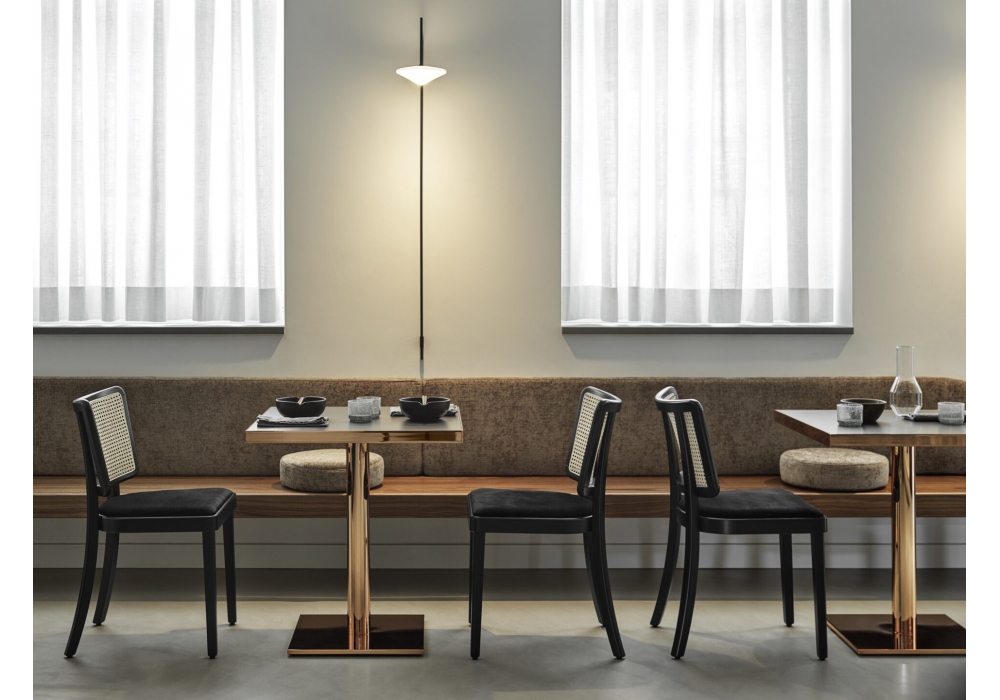 Rum firmato da Gebrüder Thonet Vienna è un tavolo da bar disponibile in due altezze. Base quadrata e stelo in metallo, nelle finiture rame lucido o ottone lucido. Top quadrato disponibile in marmo, laminato o impiallacciato rovere naturale o tinto.