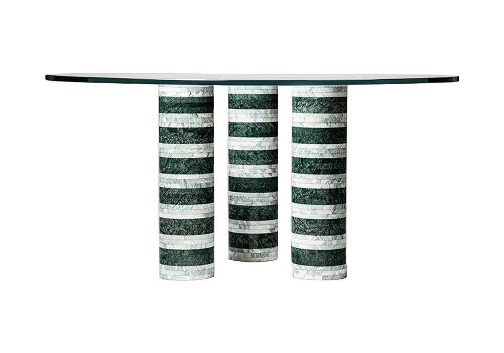Architexture Living Table 03 firmato da Patricia Urquiola per Budri è un tavolo realizzato con tre gambe in Verde Cipollino e Verde Guatemala e piano in vetro temperato extra chiaro.