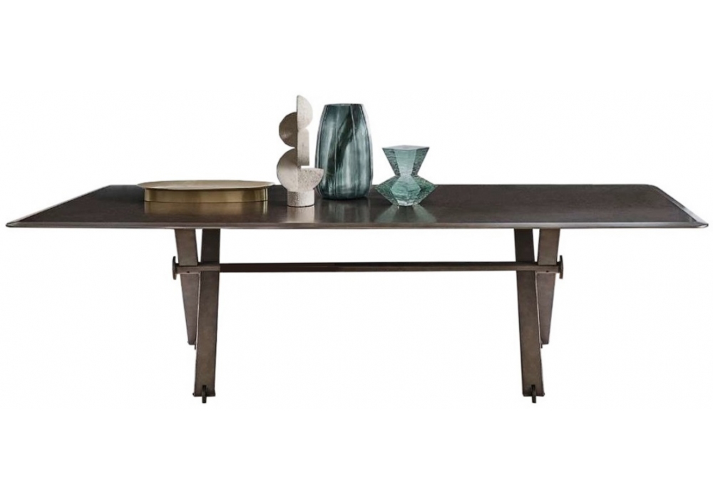 Maat Antique Bronze/Lead firmato da Pietro Russo per Gallotti&Radice è un tavolo con piano in cristallo 15mm verniciato nella finitura esclusiva bronzo antico e piombo con bisello da 35mm e struttura in alluminio e dettagli nella stessa finitura del piano.