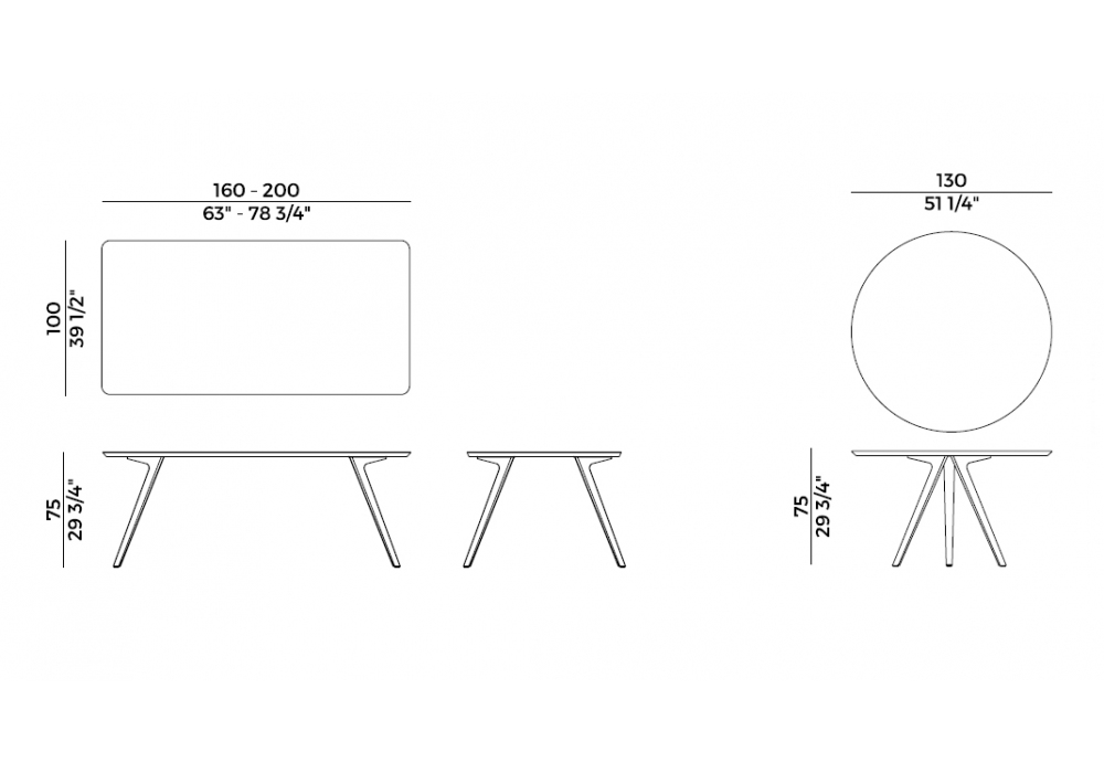 | Piano | Ø 130 cm; 160 x 100 cm; 200 x 100 cm. |
