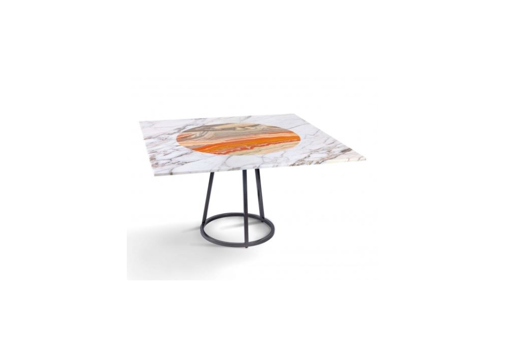 Pantheon Square firmato da Maarten De Ceulaer per Budri è un tavolo quadrato realizzato con fondo in marmo Calacatta Caldia e cerchio centrale intarsiato in Onice Fantastico. Base in metallo nero opaco.