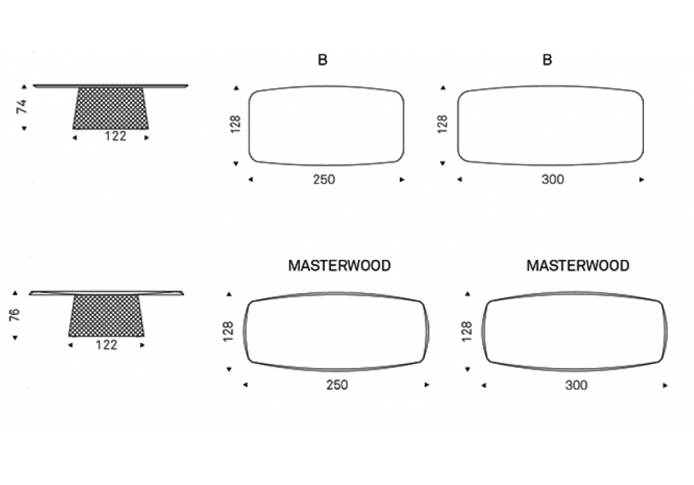 | Dimensioni | Masterwood_ 250 x 128 x H 76 cm; Masterwood_ 300 x 128 x H 76 cm; B_ 250 x 128 x H 74 cm; B_ 300 x 128 x H 74 cm |