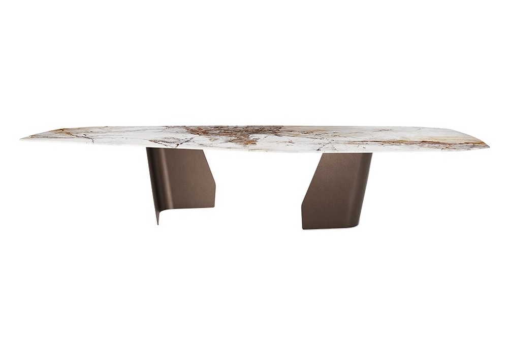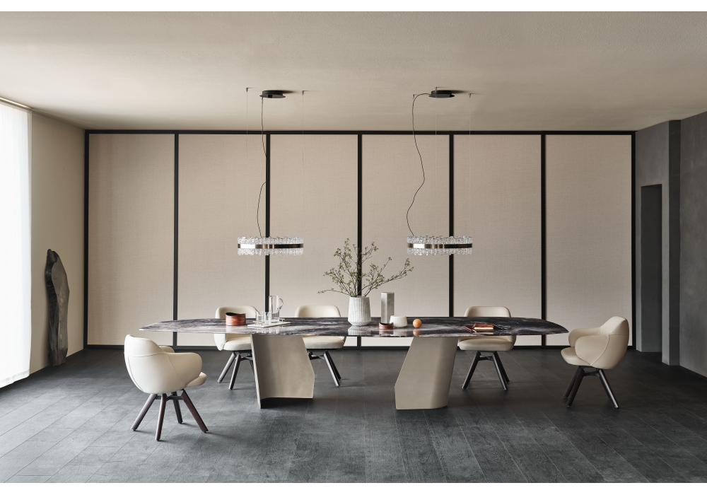 Senator firmato da Paolo Cattelan per Cattelan Italia è un tavolo con piano in cristallo extrachiaro bisellato con stampa artistica decorativa CrystalArt Marble nei colori Cotopaxi o Orobico. Base in acciaio verniciato.