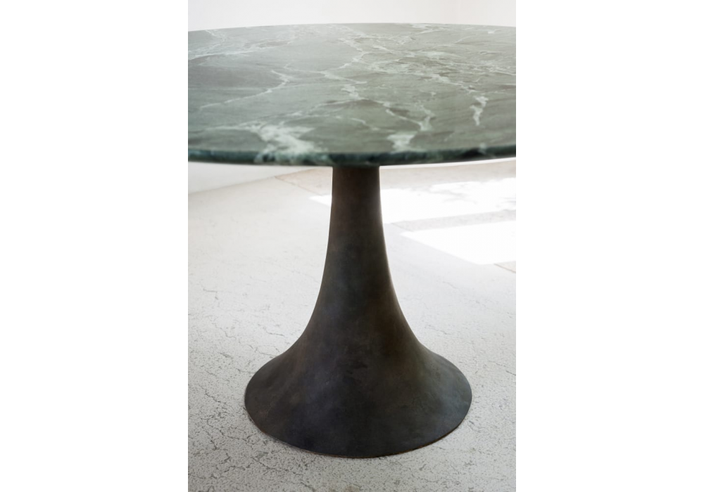 SK207 firmato da Mangiarotti per AgapeCasa è un tavolo rotondo con supporto centrale in fusione di bronzo con stampo a cera, superficie trattata con patina di nitrato d'argento steso a caldo. Il piano è realizzato in marmo in differenti finiture.