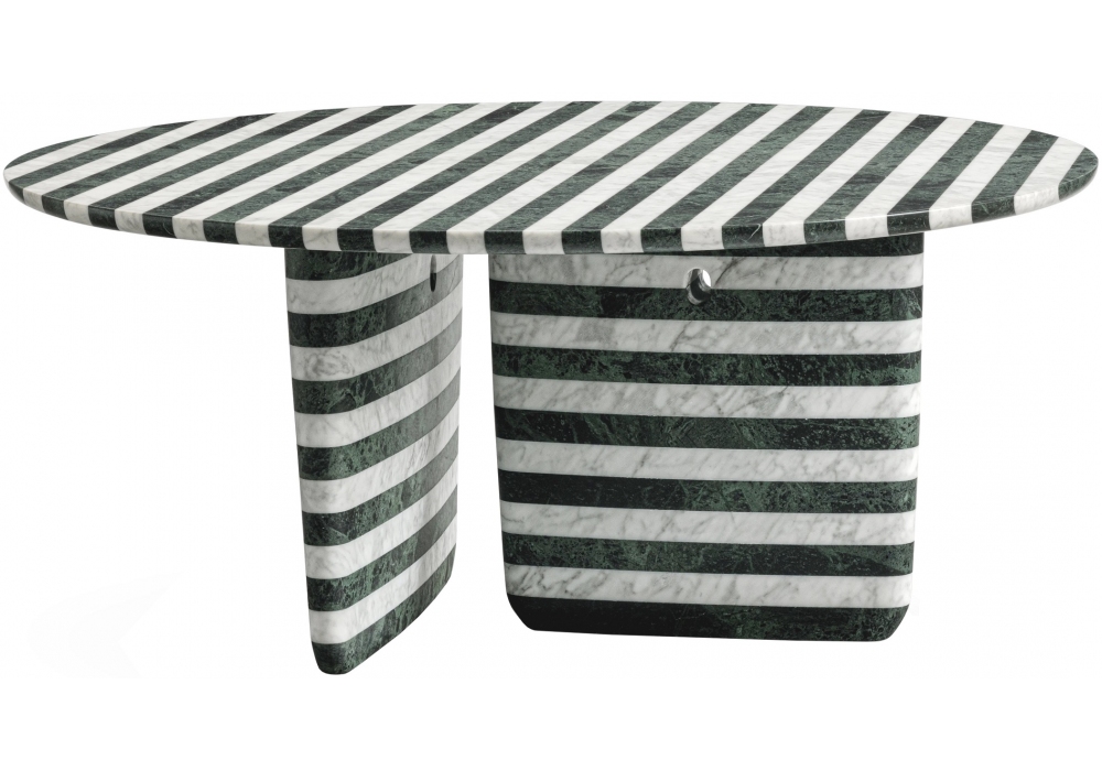 Tobi-Ishi firmato da Edward Barber e Jay Osgerby per B&B Italia è un tavolo rotondo realizzato in marmo opaco rigato bianco Carrara e verde Alpi. EDIZIONE SPECIALE 10° ANNIVERSARIO.
