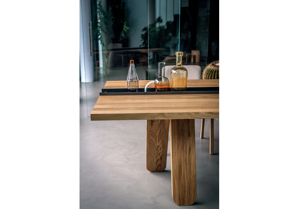 Canal firmato da Patricia Urquiola per Riva 1920 è un tavolo con top realizzato in legno massello, a liste incollate e lati squadrati. Dotato di vano centrale in ferro con funzione contenitiva. A sorreggere il piano quattro possenti gambe a sezione geometrica.