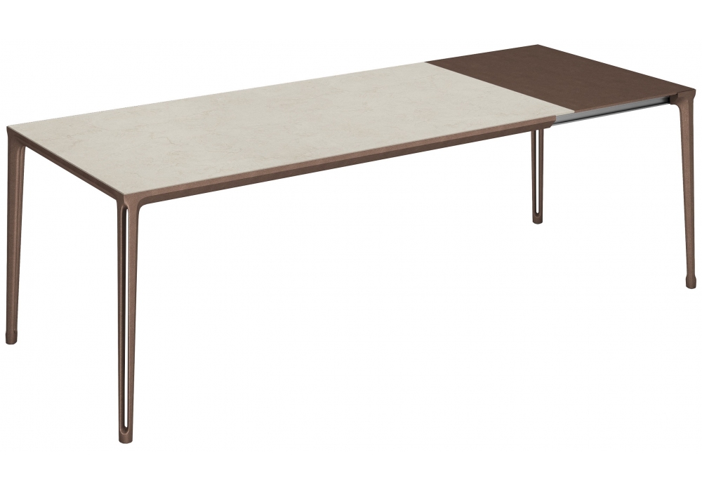 Boulevard Argile Drive firmato da Archirivolto per Cattelan Italia è un tavolo allungabile con piano in cristallo temperato spatolato in argilla e struttura in alluminio verniciato goffrato. Prolunga in legno laminato in tinta con la struttura. Disponibile in diverse dimensioni.