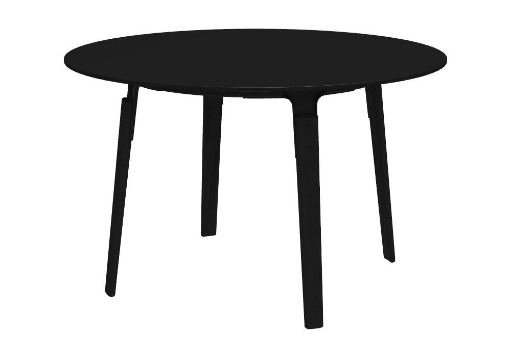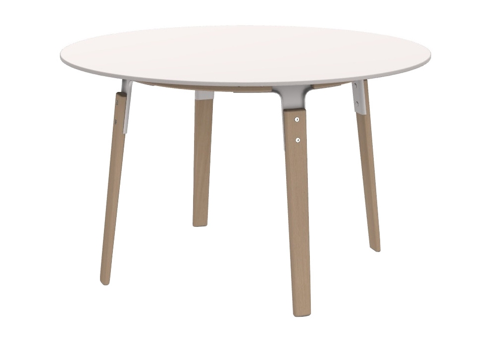 Steelwood firmato da Ronan & Erwan Bouroullec per Magis è un tavolo rotondo con struttura in faggio verniciato o naturale e piano in HPL. Disponibile in diverse finiture.