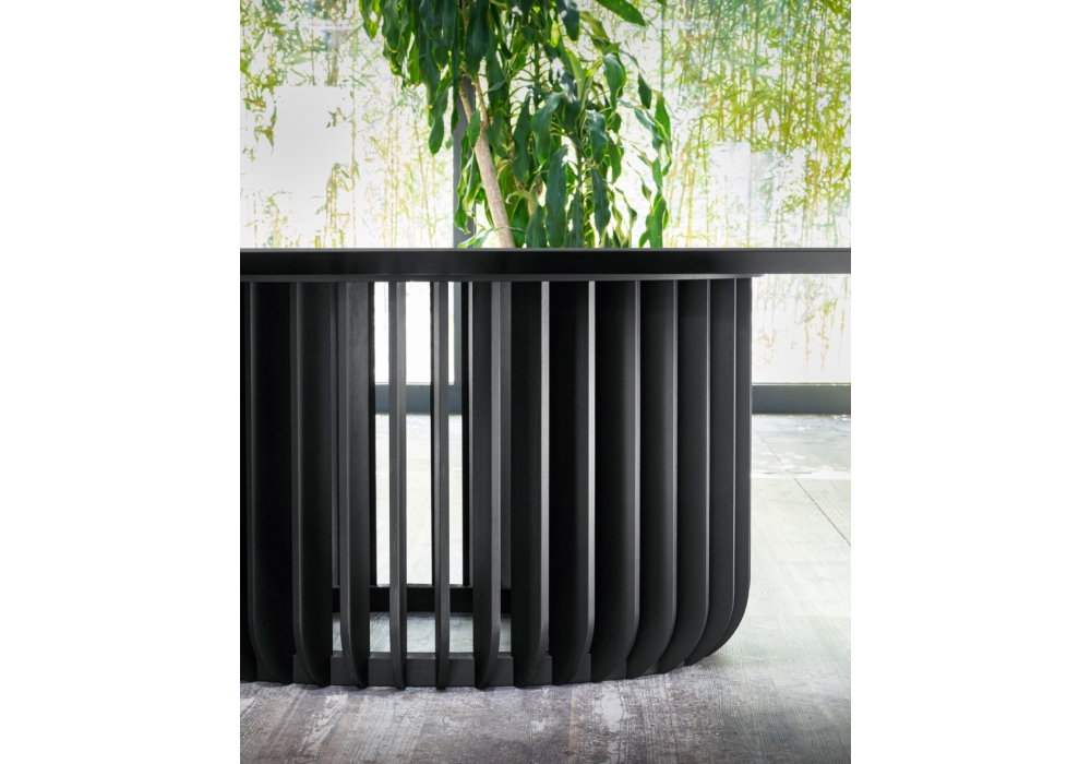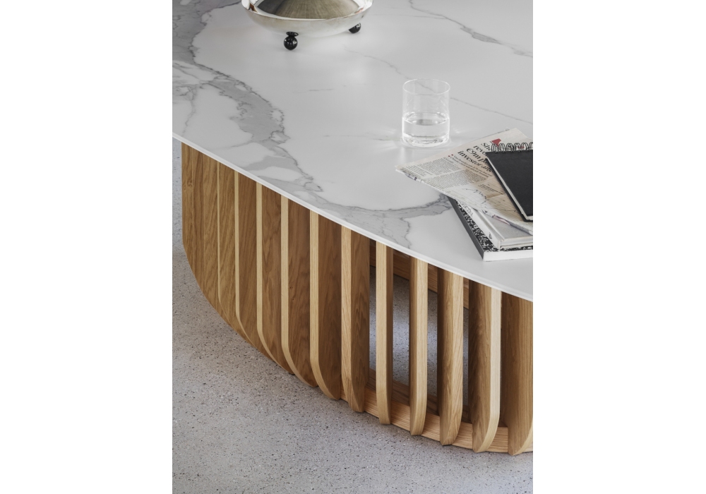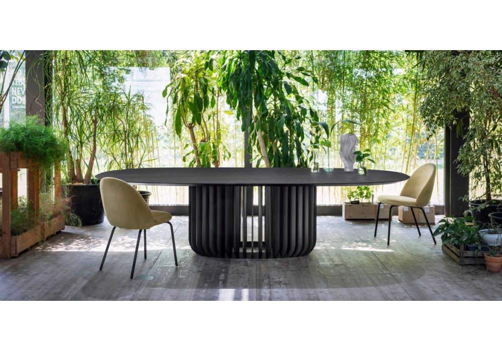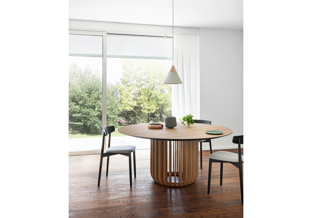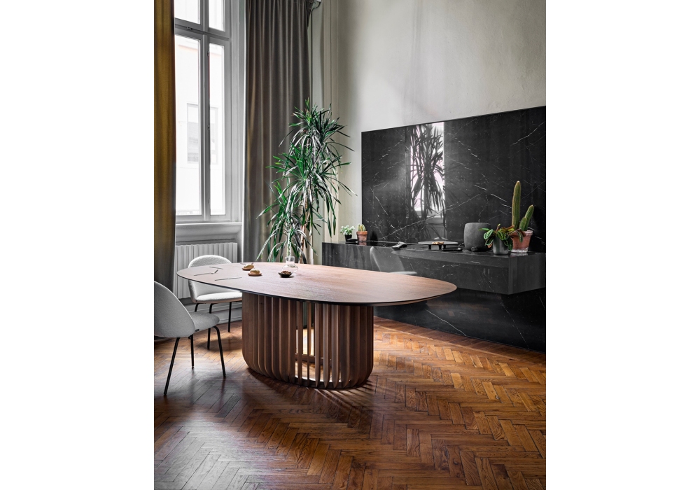Juice firmato da E-ggs per Miniforms è un tavolo con piano in essenza di legno o ceramica, base in rovere, noce o frassino. Disponibile in diverse finiture e dimensioni.