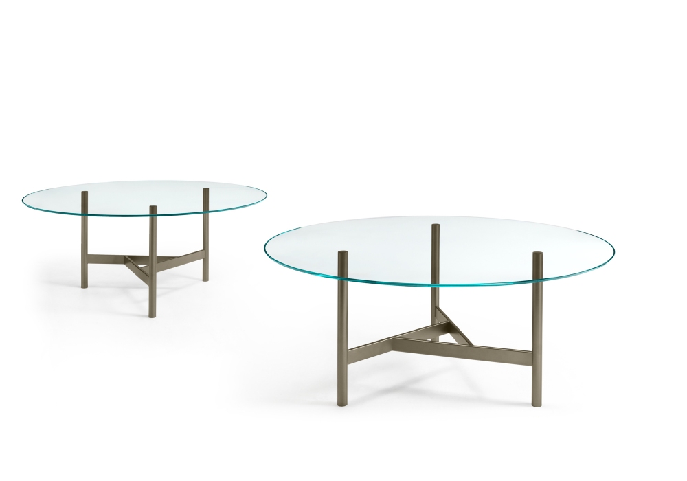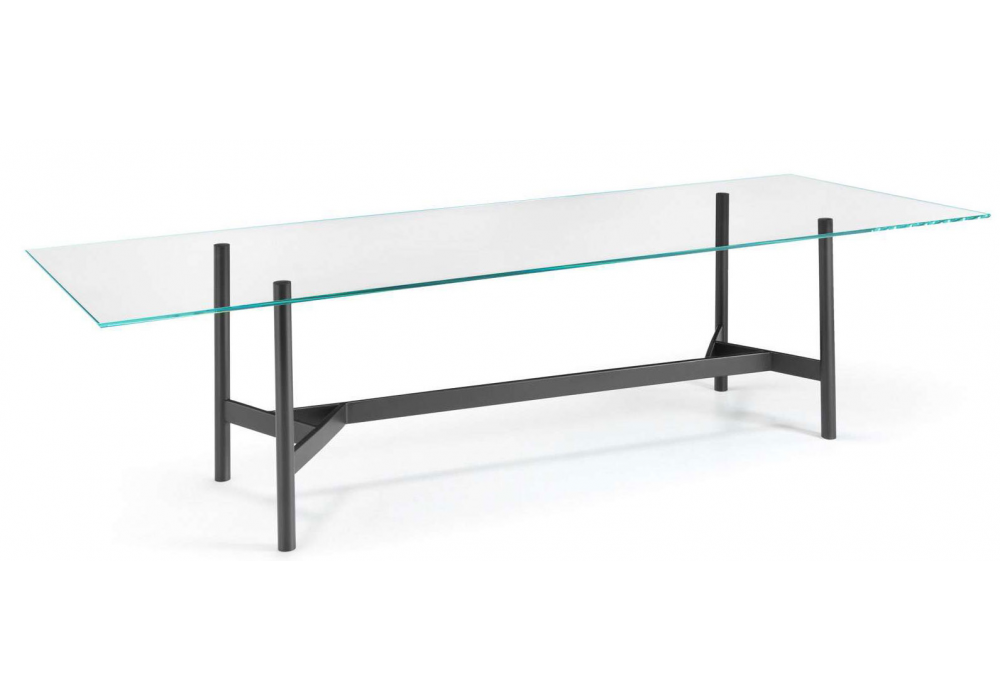 Agos firmato da Ludovica + Roberto Palomba per Fiam è un tavolo con base in metallo verniciato e piano in vetro extralight fuso, temperatto oppure bronzo o fumè stratificato e bissellato.