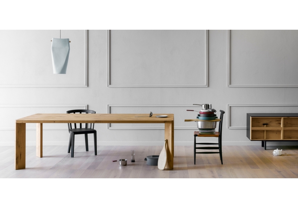 Manero firmato da Paolo Cappello è un tavolo con gambe e piano interamente in legno, disponibile in diverse finiture.