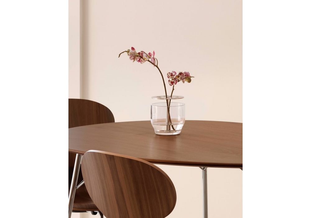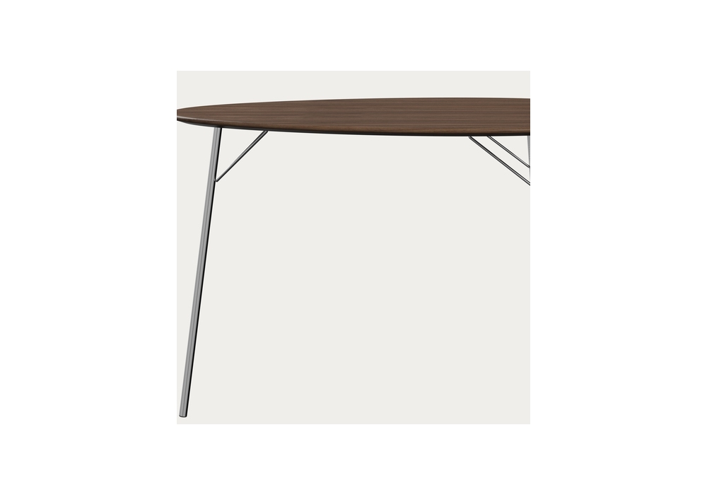 Egg™ Table firmato da Arne Jacobsen per Fritz Hansen è un tavolo realizzato con piano impiallacciato in noce certificato FSC. Base con tre gambe in acciaio cromato. Disponibile in due altezze.