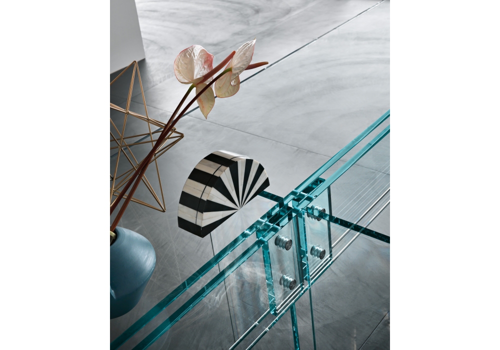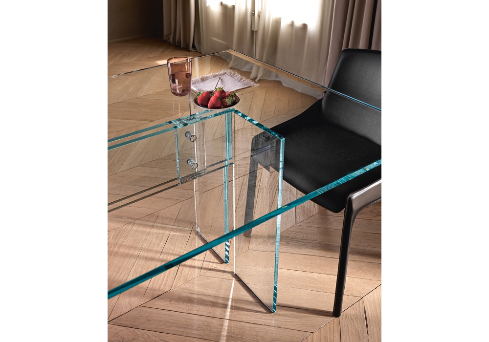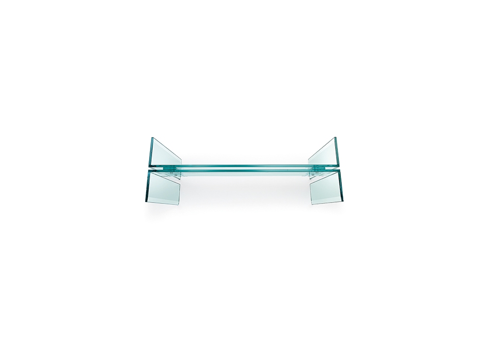 LLT firmato da Dante O. Benini & Luca Gonzo per Fiam è un tavolo con piano in vetro trasparente con bisellatura su due lati corti e struttura in vetro trasparente saldato con bisellatura sul bordo. Particolari di fissaggio in acciaio inox.