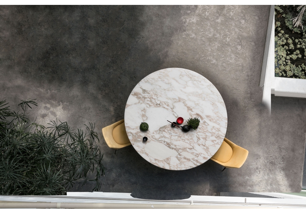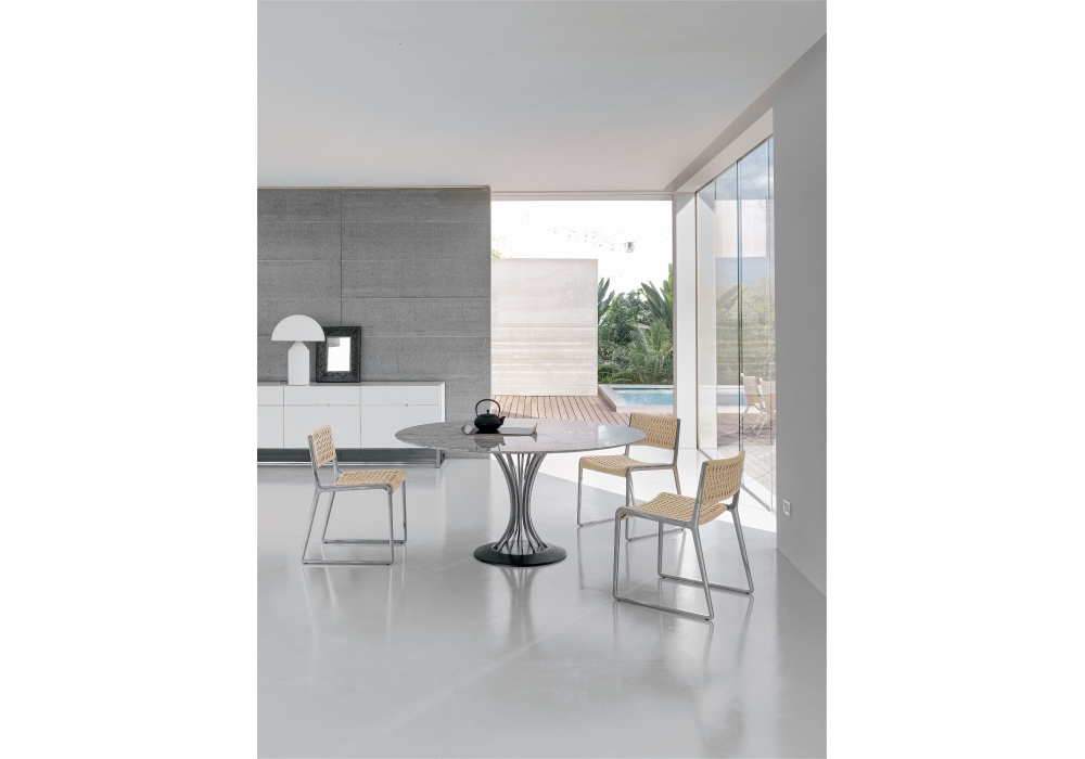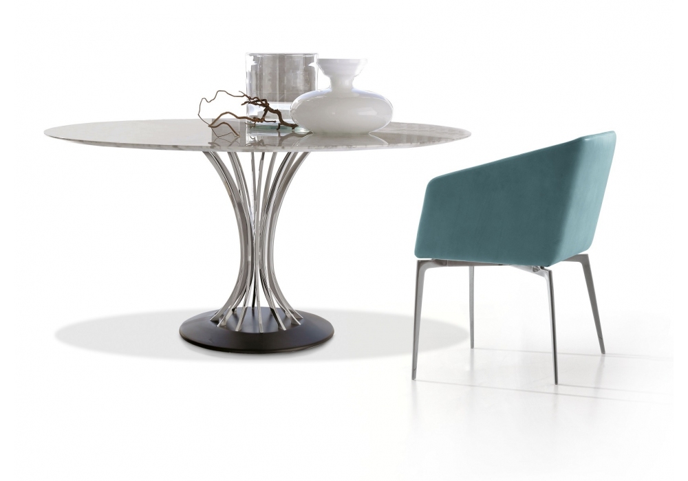 Radar firmato da Giuseppe Bavuso per Alivar è un tavolo realizzato con base in ghisa verniciata e gamba in acciaio tagliato a laser cromato o verniciato. Piano in marmo, ceramica accoppiata con vetro trasparente extra chiaro o in MDF laccato.