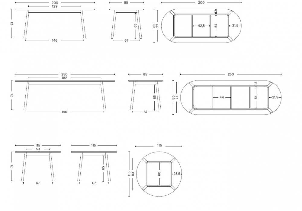 | Dimensioni | Ø 115 x H 74 cm; 200 x 85 x H 74 cm; 250 x 85 x H 74 cm. |