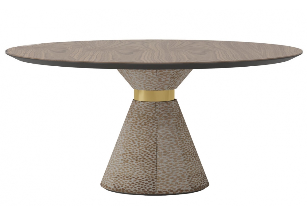 Cameron Round firmato e prodotto da Gual Design è un tavolo con base in tessuto strutturato con anello in acciaio dorato e piano in legno di noce impiallacciato.