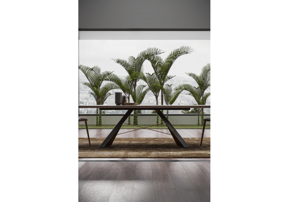 Charlize firmato da Gualter Torres per Gual Design è un tavolo con base in ferro laccato nero con 2 corde in sisal incrociate. Piano impiallacciato in legno di noce, eucalipto, ebano o rovere. Disponibile in differenti dimensioni.