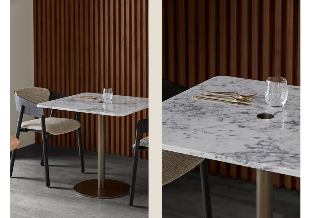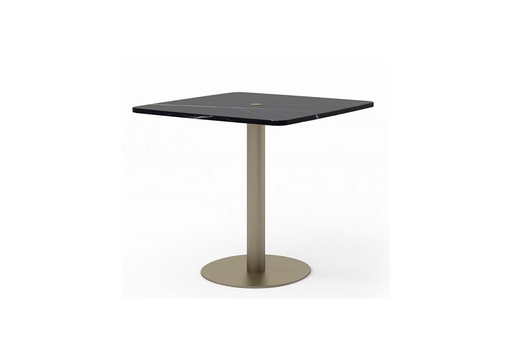 Nucleo firmato da Victor Carrasco per Punt è un tavolo bar con struttura in acciaio verniciato a polvere nera o bronzo e piano in MDF impiallacciato rovere o noce o in marmo dai bordi smussati a vista. Disponibile in differenti dimensioni e finiture.
