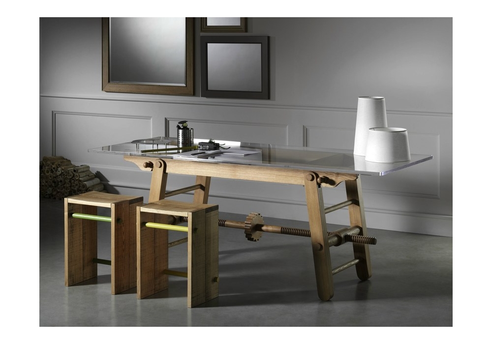 Compasso firmato da L'Ottocento è un tavolo realizzato artigianalmente, con la struttura completamente in frassino ed il piano superiore in cristallo extrachiaro. Agendo manualmente sulla vite centrale è possibile passare da un’altezza tavolo di 78 cm, ad ina intermedia di 85 cm, fino a 90 cm, quota ideale per essere utilizzato come bancone o tavolo da lavoro.