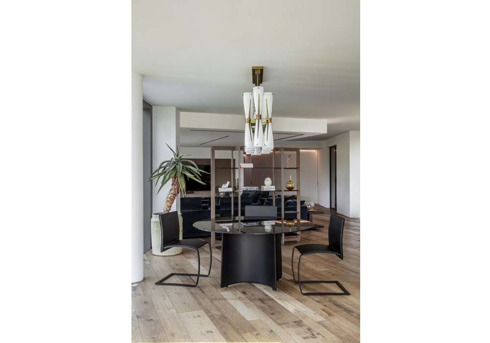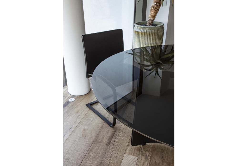 Butterfly firmato da Studio Nove.3 per Enrico Pellizzoni è un tavolo rotondo con basamento centrale in lamiera piegata rivestita in cuoio. Top rotondo in vetro, disponibile in diverse finiture e dimensioni.