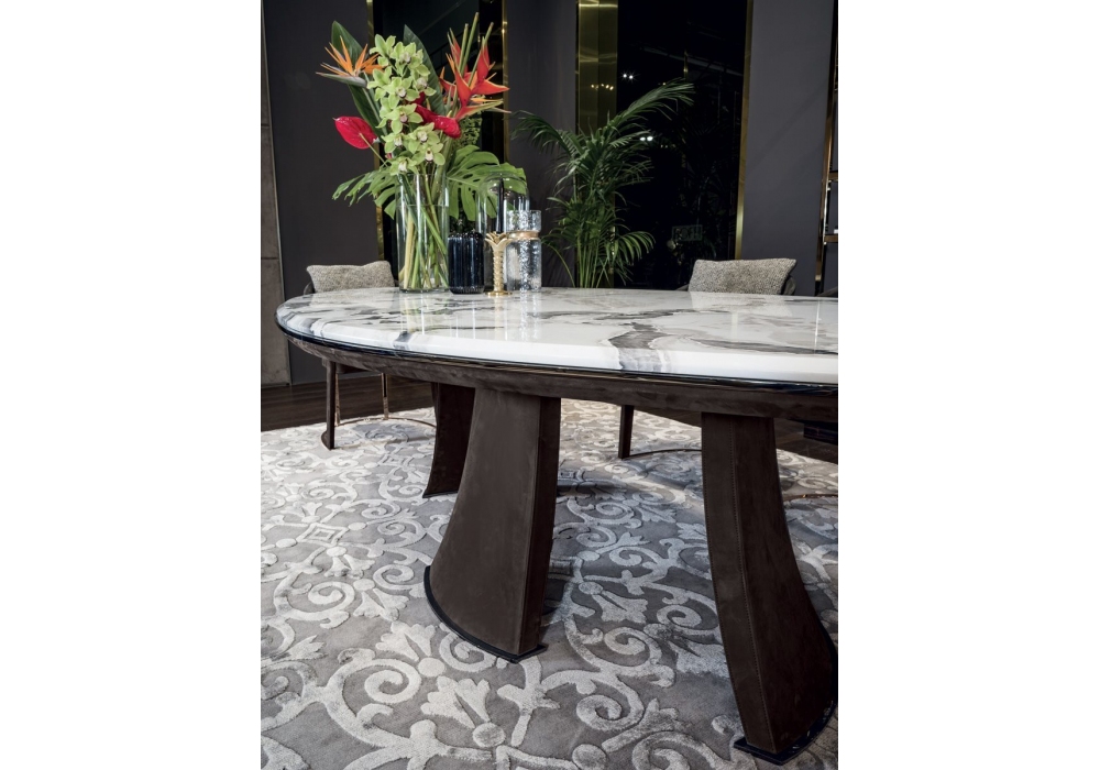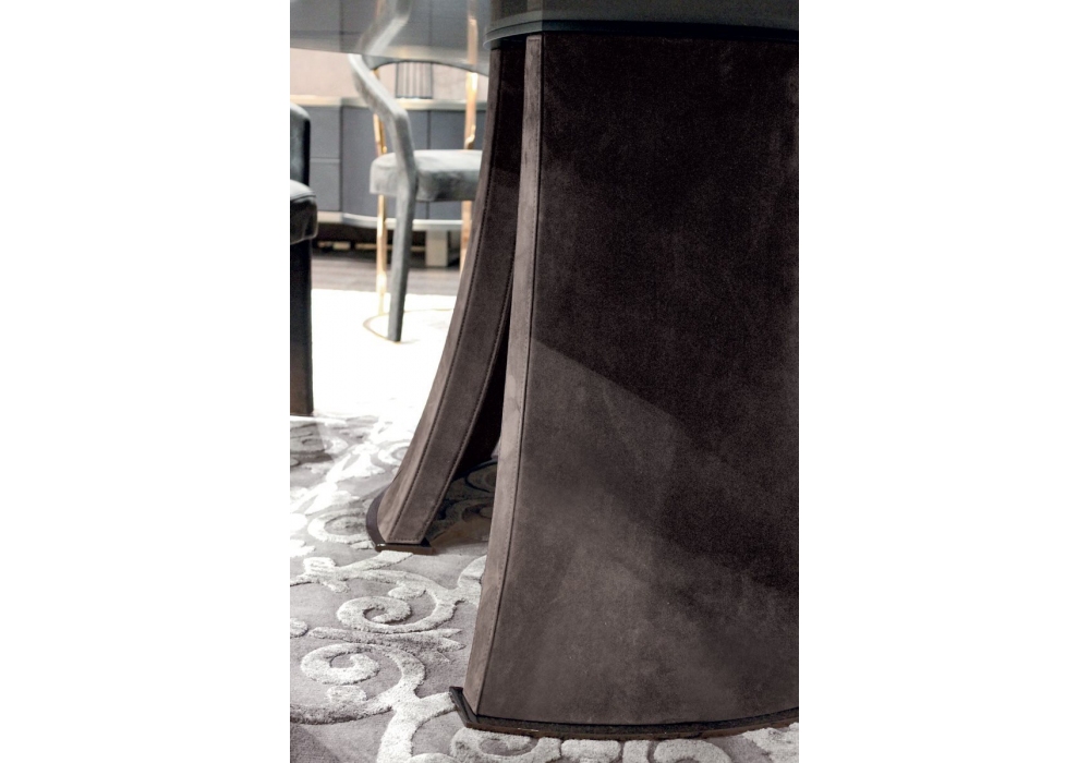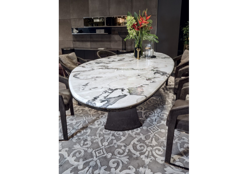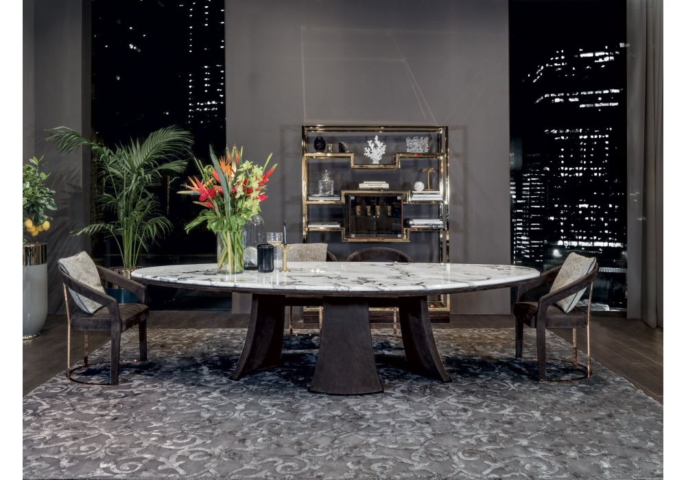 Damien firmato da Giuseppe Viganò per Longhi è un tavolo con base a tre gambe realizzate con stampo schiumato ad alta densità strutturale e rivestite in pelle. Parti metalliche con finitura lucida o opaca e piano in marmo o specchio. Disponibile in differenti dimensioni e finiture.