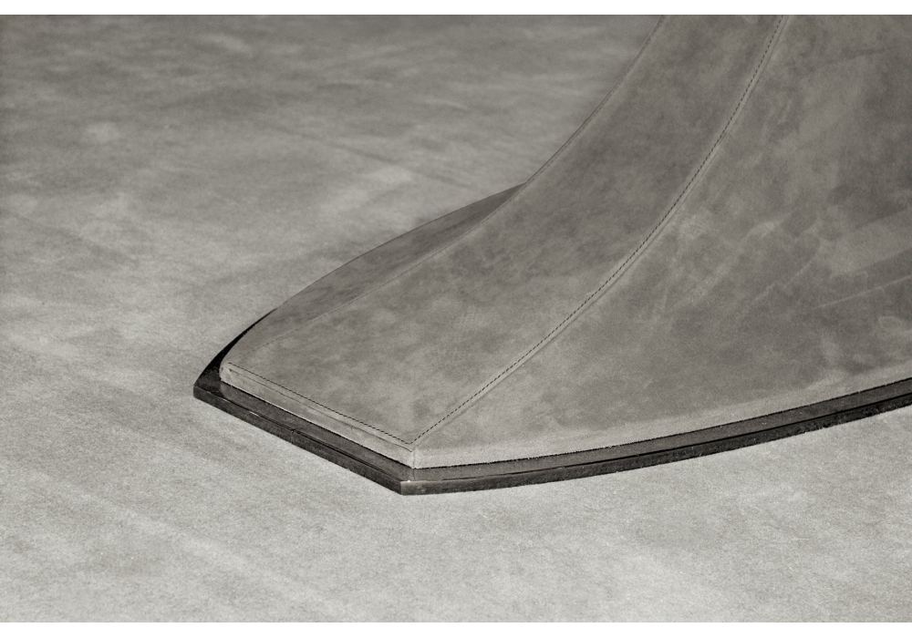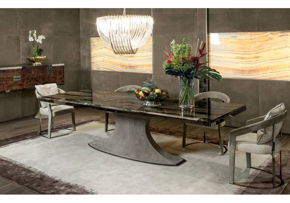 Hubert firmato da Giuseppe Viganò per Longhi è un tavolo con base in vetroresina con struttura interna in metallo verniciato e rivestita in pelle. Piastra sottobase e bordo sottopiano in metallo lucido o opaco. Piano in marmo o specchio. Disponibile in differenti dimensioni.