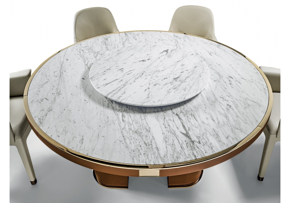 Journey Round firmato da Ben Wu per Longhi è un tavolo rotondo con due gambe in vetroresina rivestite esternamente in pelle, ed internamente da una lamiera in metallo lucida o opaca. Piedino alla fine della gamba in tinta all' interno. Piano in marmo. Disponibile nella versione con piatto girevole Lazy Susan in differenti dimensioni e finiture.
