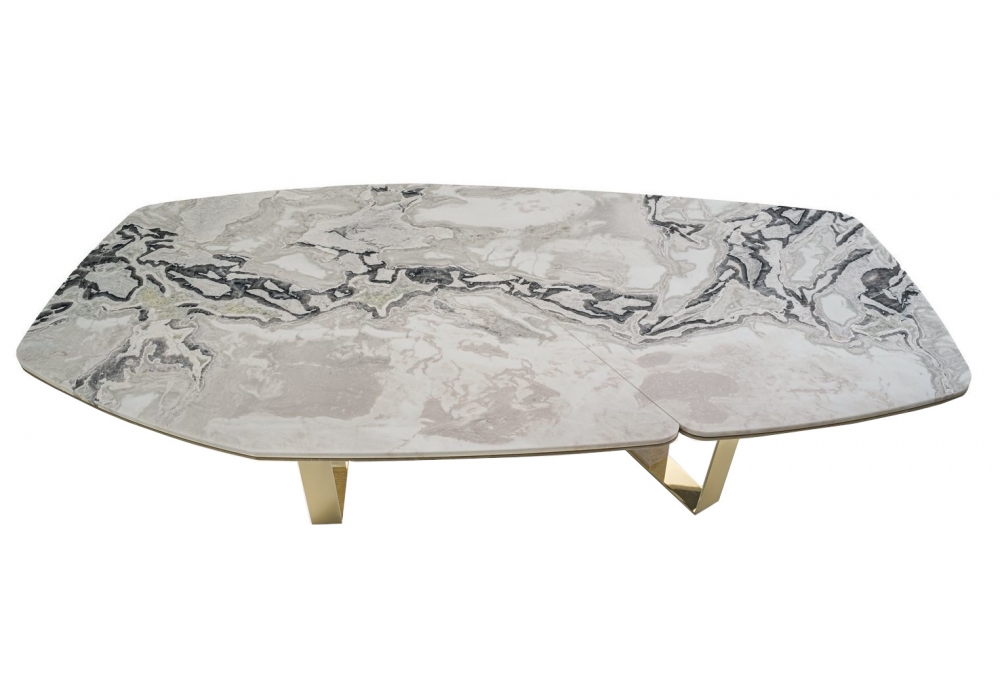 Keope firmato da Giuseppe Viganò per Longhi è un tavolo con due gambe trapezoidali in metallo rettificato tagliato al laser con inserti rivestiti in pelle. Piano sagomato e sezionato multimaterico, realizzato in marmo e diviso in 2 o 3 parti. Su richiesta è disponibile il piano con parti componibili in finiture diverse.