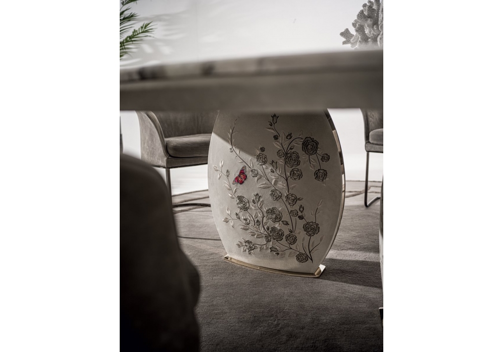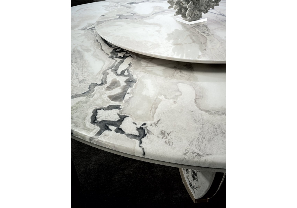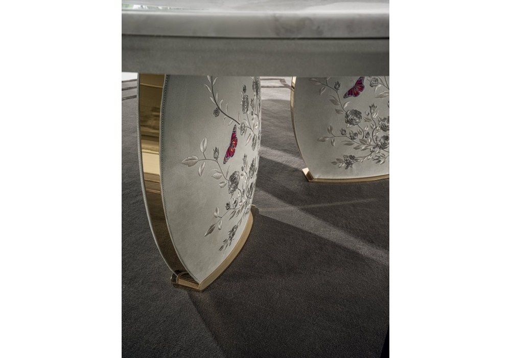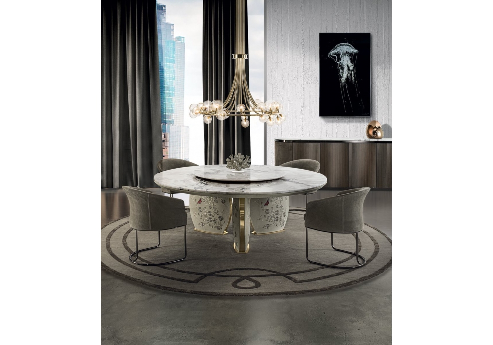Lotus Round firmato da Giuseppe Iasparra per Longhi è un tavolo rotondo con gambe realizzate con stampo schiumato ad alta densità, rivestite in pelle e con decoro ricamato effetto “Marlène”. Parti metalliche lucide o opache. Piano in marmo con possibilità di aggiungere piatto girevole Lazy Susan in diverse dimensioni e finiture. Sottopiano in pelle in tinta alle gambe. Su richiesta è disponibile il rivestimento senza decoro.