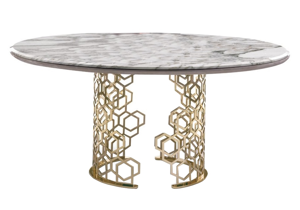 Manfred Round firmato da Giuseppe Iasparra per Longhi è un tavolo rotondo con struttura in metallo rettificato tagliato al laser con decoro Sequence e curvato. Piano in marmo o cristallo. É possibile scegliere la versione con o senza piatto girevole Lazy Susan in diverse dimensioni e finiture.
