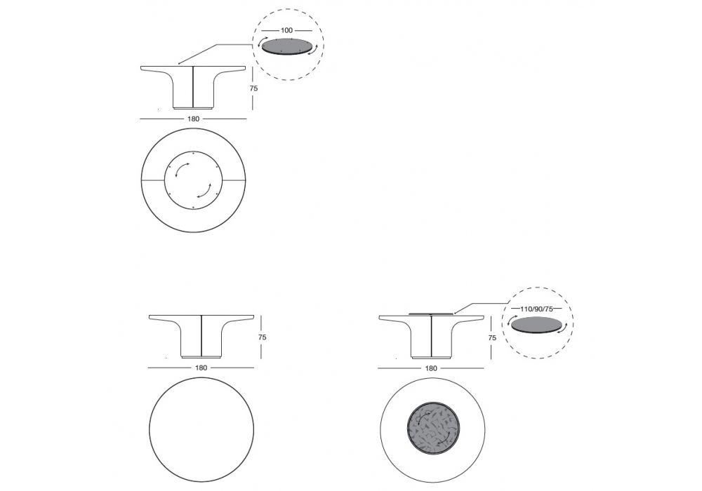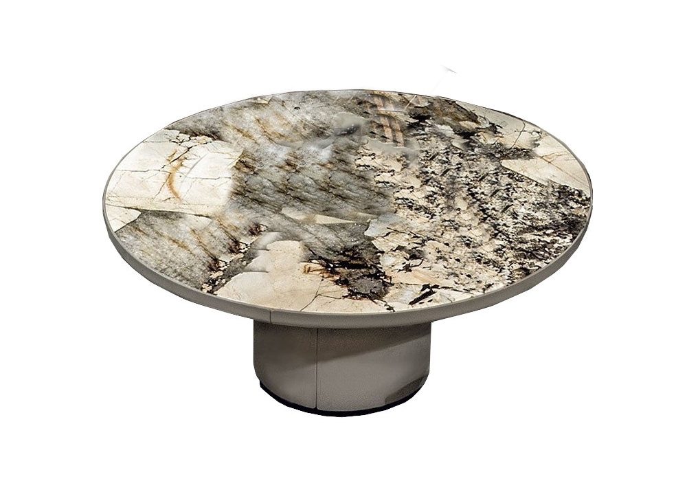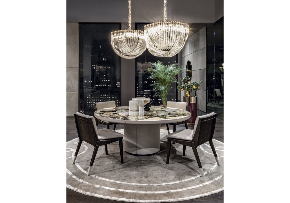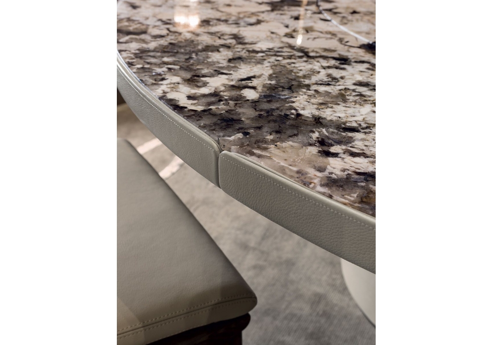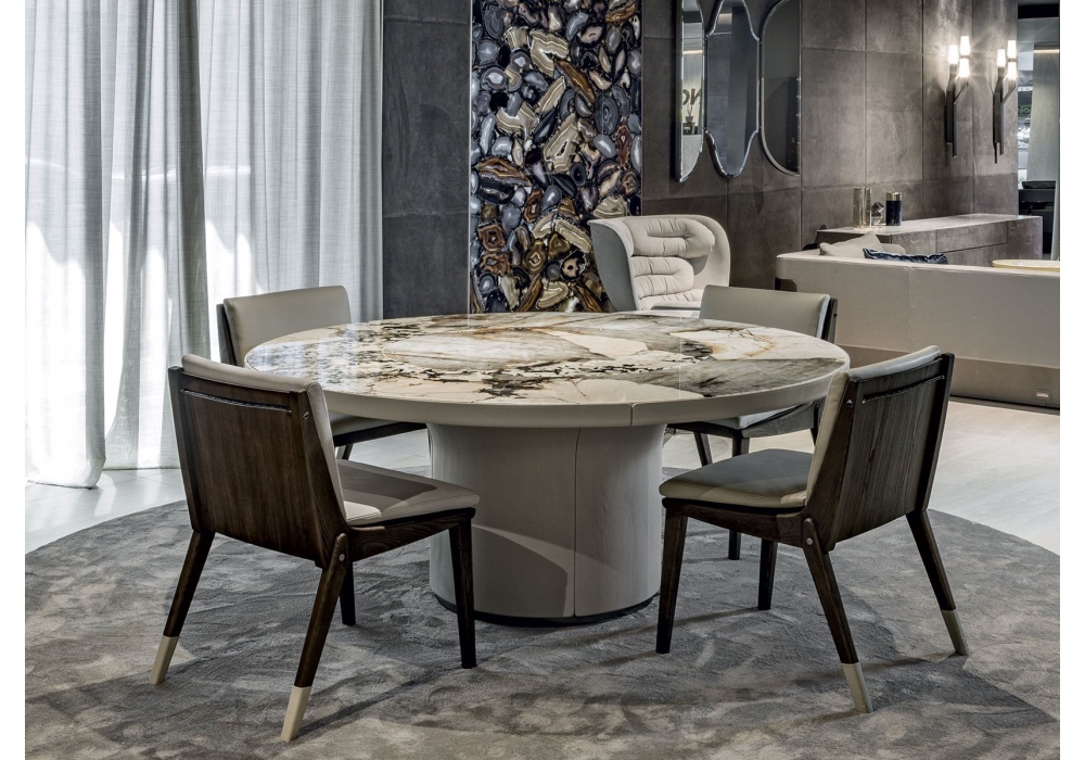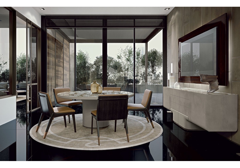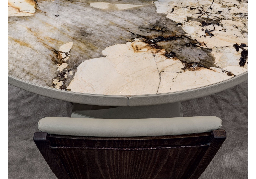 Re firmato da Ben Wu per Longhi è un tavolo rotondo con struttura interna in metallo verniciato e scocca in vetroresina a stampo manuale rivestita in pelle. Bordo inferiore in metallo rettificato lucido o oapco. Piano in marmo , legno in essenza o specchio con possibilità di inserire il piano girevole incassato nel piano o in rilievo Lazy Susan. Su richiesta è disponibile un attuatore lineare elettrico che movimenta il piano girevole per agevolare la pulizia e la manutenzione.