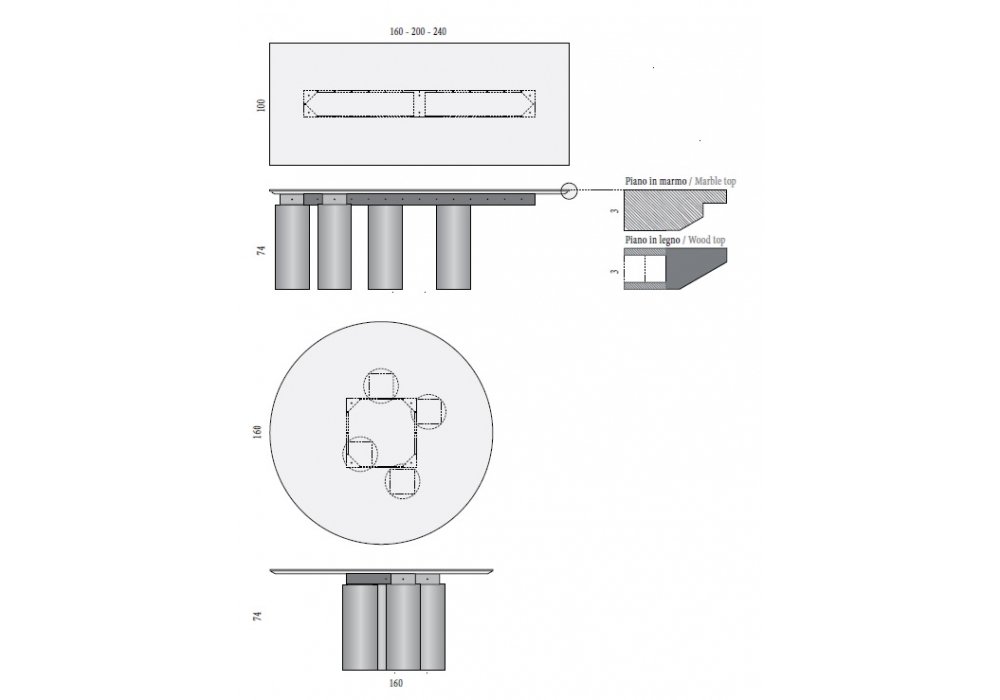 | Dimensioni | 160 x 100 x H 74 cm; 200 x 100 x H 74 cm; 240 x 100 x H 74 cm; 157 160 x H 74 cm. |