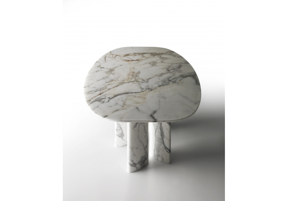 Ellenico firmato da Enzo Berti per Kreoo è un tavolo realizzato interamente in marmo. Caratterizzato da sei basi di forma ellissoidale allungate con oriengtamenti diversi e piano ovale che poggia su una sottile struttura e si distanzia rispetto alle gambe sembrando quasi sospeso. Disponibile in diverse finiture.