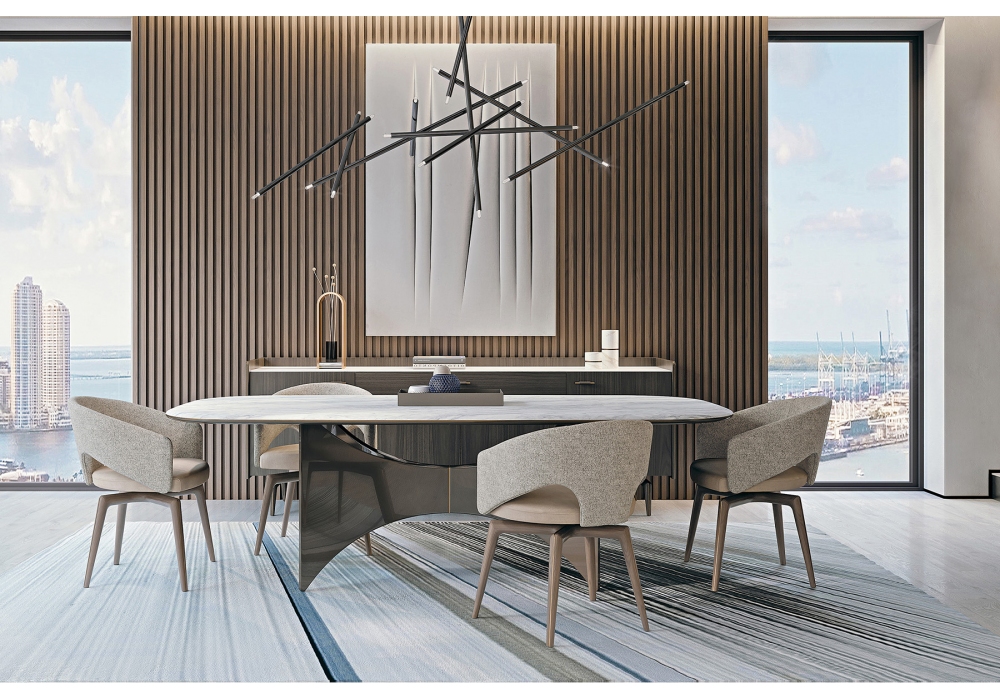 Blues firmato da Giuseppe Viganò per Turri è un tavolo con struttura in in pannello di particelle di legno curvato impiallacciato noce o MDF in finitura laccato monocolore poliestere lucido. Piano impiallacciato noce o marmo.